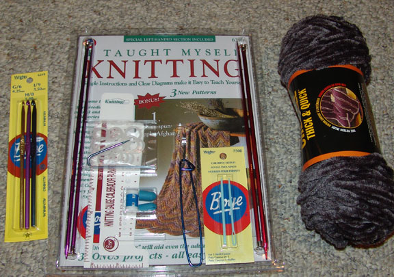 My intention is to make this scarf. Turns out though that when you look at the instructions, the kit comes with the wrong size needles. Oh well, I'll give it a shot anyway. So, I start on the book and quickly find I'm all thumbs. I look on the internet and found a site with cool videos to learn how to knit and I'm casting on in no time flat!