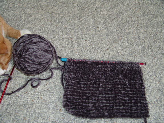 I'm doing a stockinette stitch now. Trouble discovers my new project...